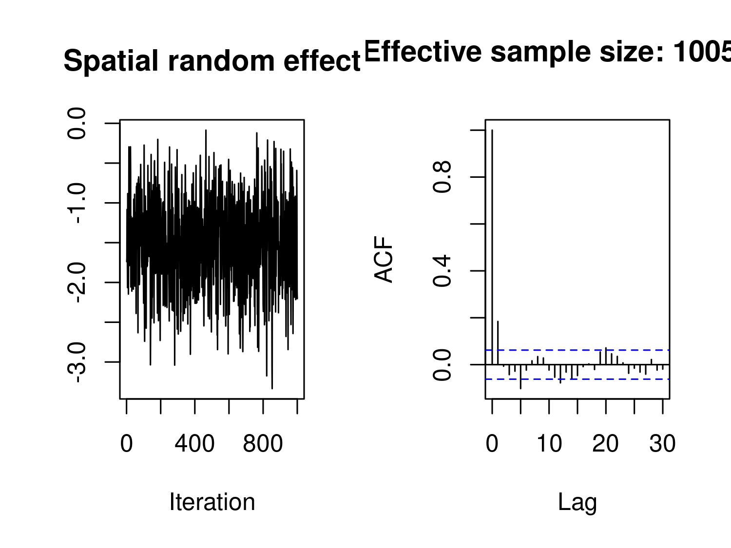 The plot shown in Figure 3.12 are for the MCMC samples of the averaged spatial random effect, that is \(\bar{S} = \sum_{i=1}^n S(x_i) /n\). Performing the check on \(\bar{S}\) is done to avoid the need of checking the convergence for each individual component \(S(x_i)\). However, one of the risks of doing this is that if fewer components of \(\bar{S}\) have not reached convergence this may not be shown through the inspection of the samples for \(\bar{S}\). However, this is an unlikely scenario when using the type of MCMC algorithm implemented in RiskMap