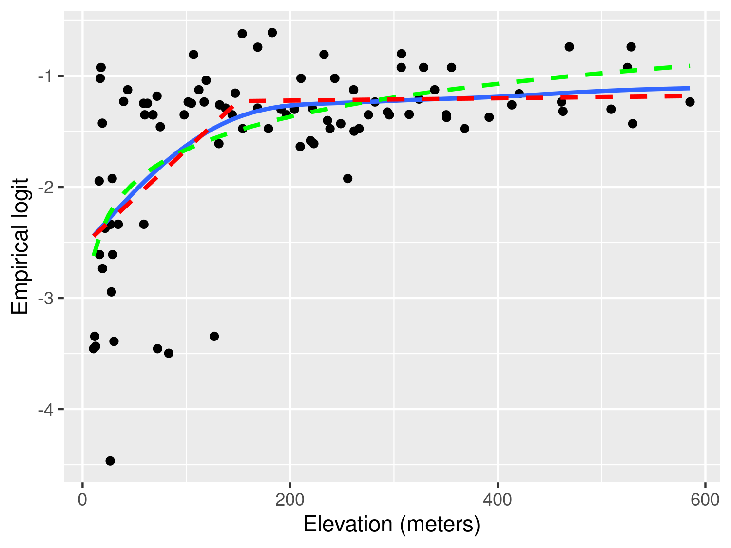 Figure 3.2 shows the scatter plot of the empirical logit against elevation. In this plot, we have also added three lines though the stat_smooth
