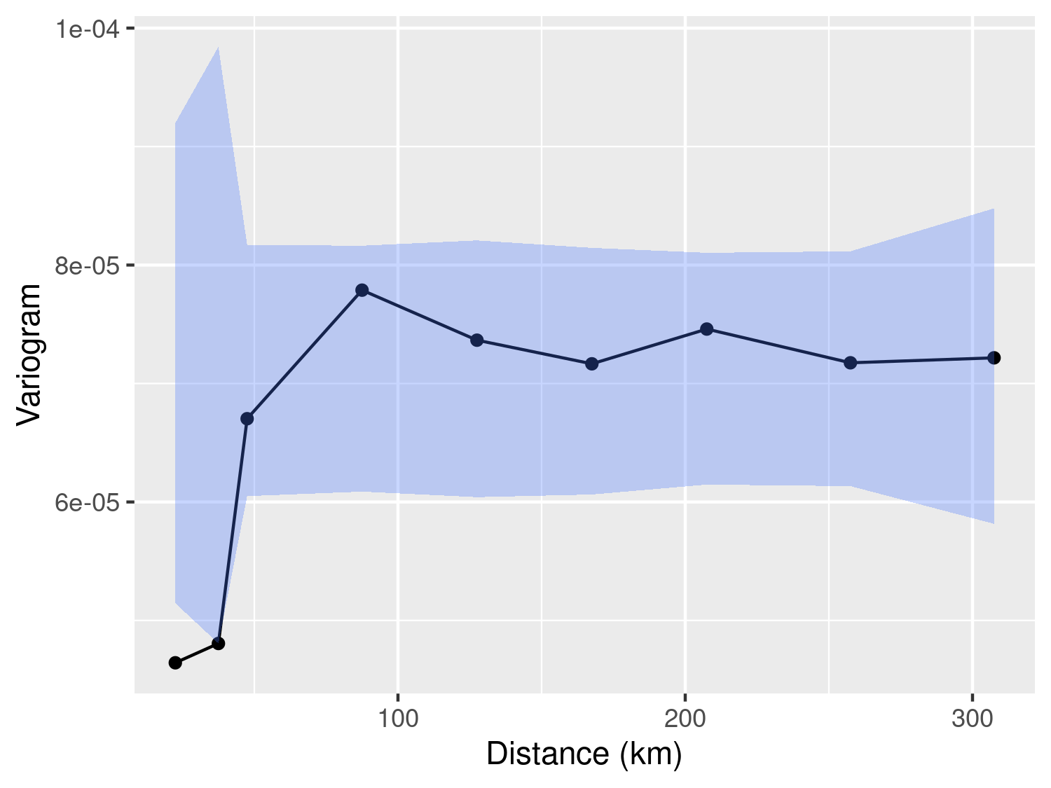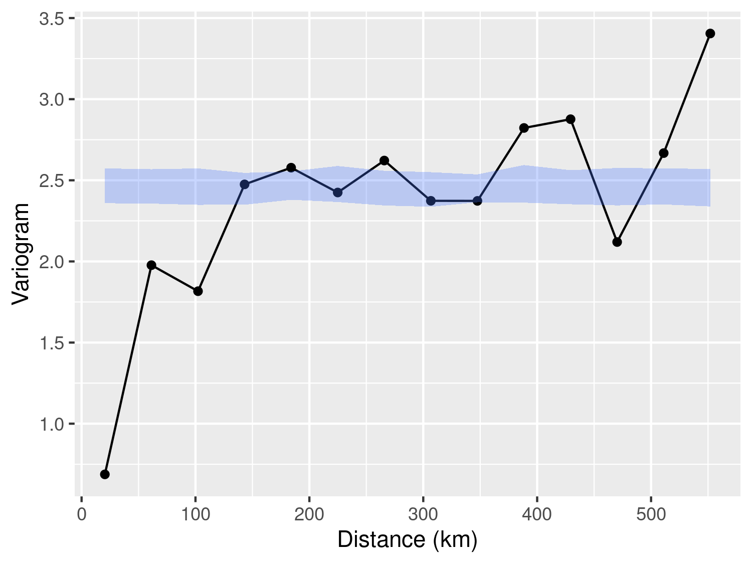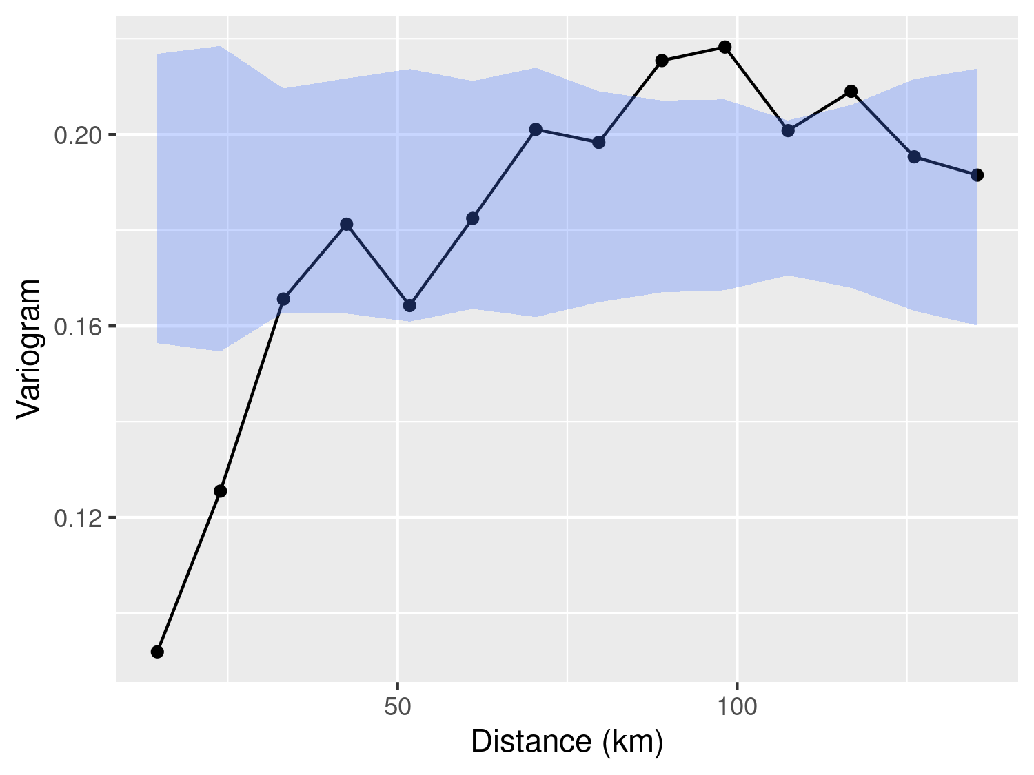 \] where \(d(x_i)\) is the measured elevation at location \(x_i\). How strong is the overdispersion in the data? After fitting the model, extract the estimates of the random effects \(Z_i\) and compute the empirical variogram with the 95% envelope for spatial independence. Repeat this for different classes of distances by changing the input passed to bins