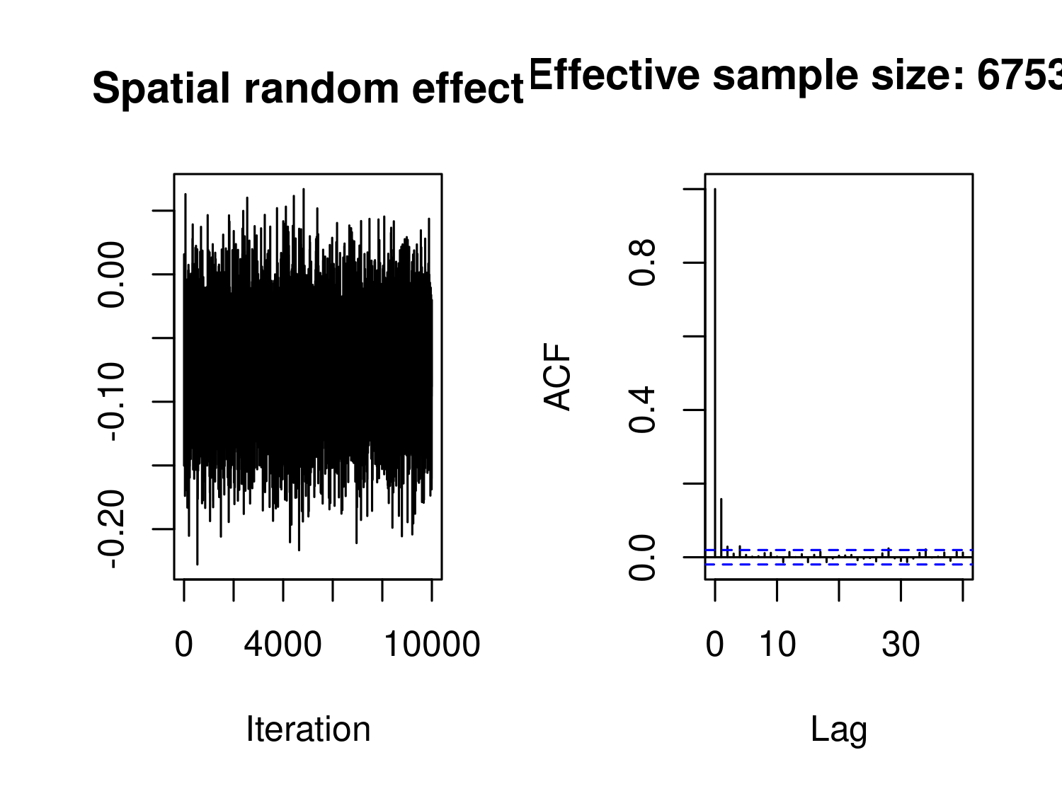 To better illustrate some of the points above, we continue the analysis of the Liberia data from Section 3.3.1. Diagnostic summaries on the convergence of the MCMC algorithm can be obtained with the check_mcmc