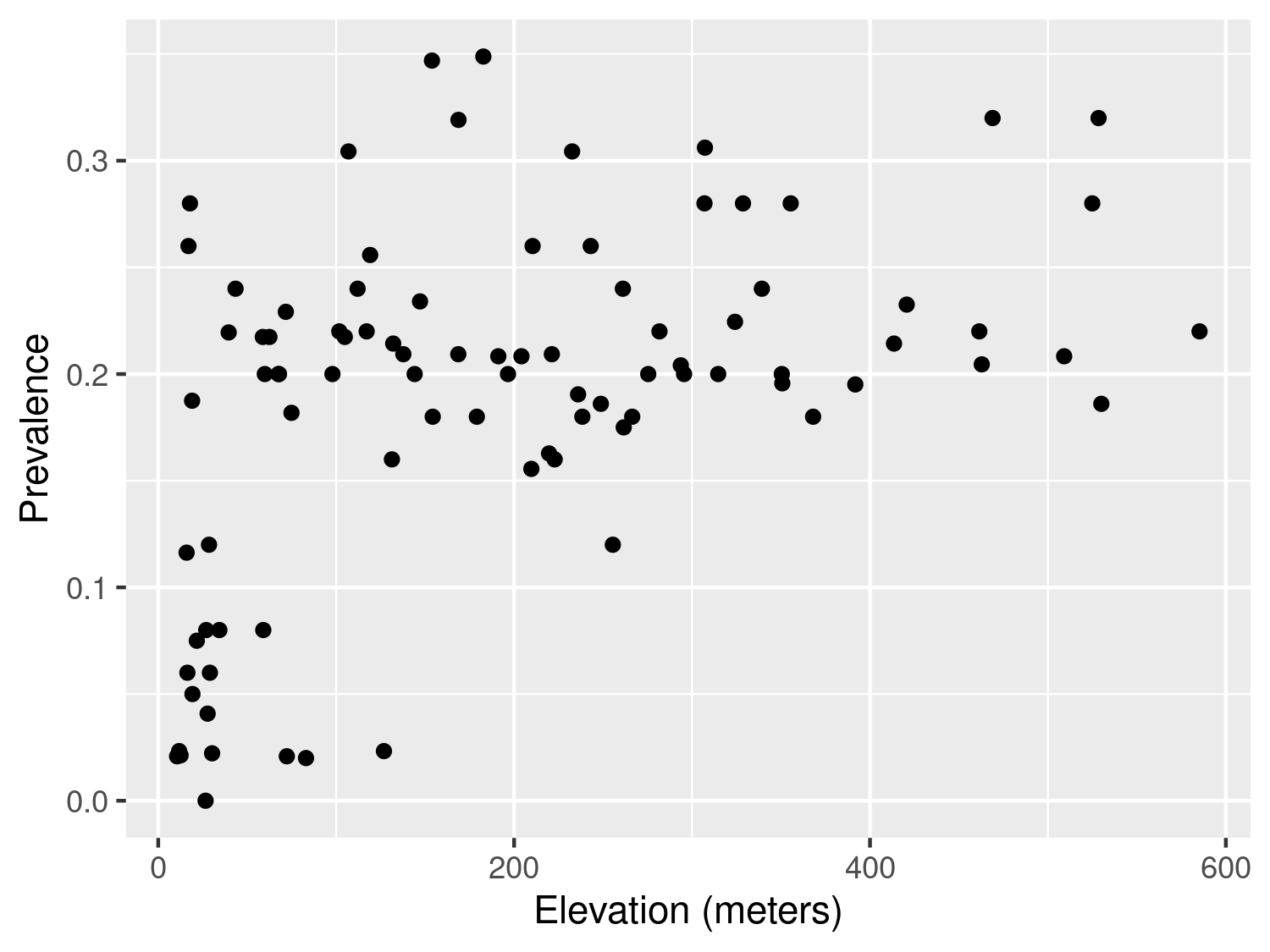 ggplot(liberia, aes(x = elevation, y = prev)) + geom_point() +