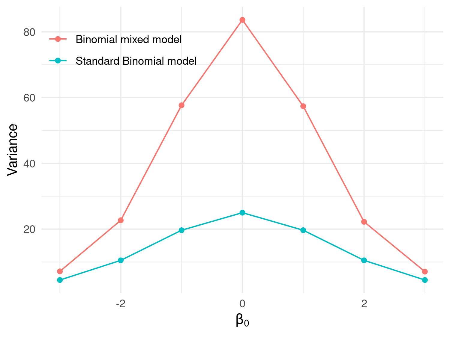 Consider the Binomial mixed model with linear predictor as defined in Equation 3.7. By editing the code for the simulation shown in Section 3.1.2, generate a graph as in Figure 3.6 under the two following scenarios: \(i\)) \(\tau^2 = 0.2\) and \(n_i=100\); \(ii\)) \(\tau^2 = 0.1\) and \(n_i = 1\). How does the variance of \(Y_i\) change under \(i\)) and \(ii\)) in comparison to Figure 3.6? How do you explain the differences?